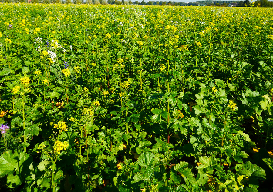 Als ich heute Mittag in der Nähe von Schloss Pesch dieses blühende Feld fotografierte, sah ich auf den Blüten die eine oder andere Biene. Sehr wahrscheinlich stammen sie aus einem meiner Völker. Die Luftlinie zwischen ihnen und dem Acker mit den überwiegend hier blühenden Senfpflanzen beträgt ca. 500 m. Ich hatte bei Ihnen schon eine ganze Reihe von Pollensammlerinnen beobachten können. Jetzt weiß ich, wo sie ihre gelben Höschen herhaben.