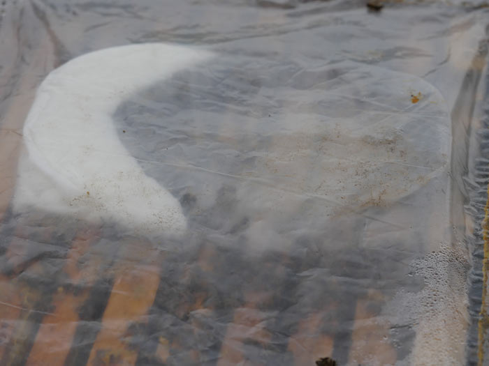 Bei der heutigen Kontrolle bot sich mir ein unterschiedliches Bild. Ein Volk hatte den Futterteig zum größten Teil ausgefressen, ein anderes leerte die Folie komplett. Am Niederschlag unter der Folie können Sie den Brutstatus gut erkennen.
