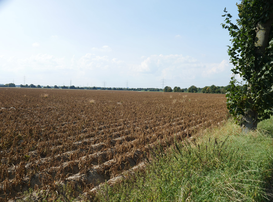 Möchten Sie Kartoffeln von diesem Acker essen? Ich jedenfalls nicht. Das Foto, das ich als ein Bespiel am 1. September zwischen Osterrath und Krefeld aufgenommen habe, zeigt einen toten Kartoffelacker. Das Kraut und mit ihm alle anderen Kräuter sind flächendeckend abgestorben. Genauer gesagt totgespritzt.
