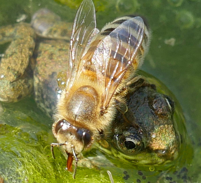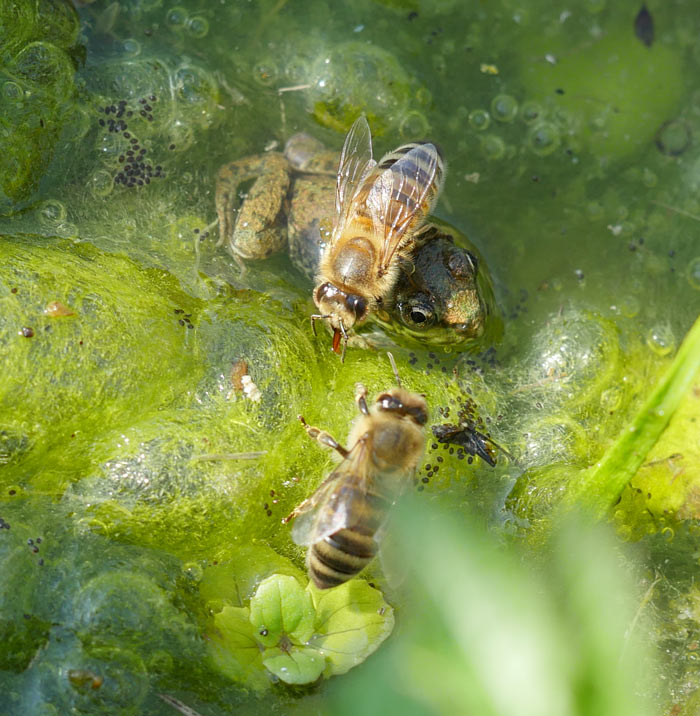 das Wasser in ihre Honigblase pumpen, dann heimwärts fliegen und wieder neu starten. – Nur die eine scheint noch immer nicht geschnallt zu haben, dass sie auf einem gut getarnten Frosch gelandet ist. Der macht einen depperten Eindruck und scheint seinerseits noch gar nicht mitbekommen zu haben, in welche Geschichte er da geraten ist Man möchte den beiden Wasserholerinnen zurufen: Haut ab, der steht auf leckeren Bienen. Aber vielleicht sind sie ja schlau & schneller. Oder vermitteln ihm in welcher Sprache auch immer: Ganz ruhig Freundchen, oder ich stech dich.