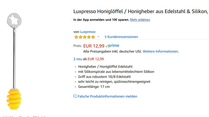 Dann googelte ich »Honiglöffel“. Der erste Fund bestand in einem eigenwillig geformten Teil aus glänzendem Edelstahl, das auch patentiert sein soll. Kostenpunkt 24,95 € zuzüglich Versand. Weiter gibt es „Honiglöffel« genau wie jene Silikon–Olive auf dem Foto, allerdings aus Buchen- wie Olivenholz.