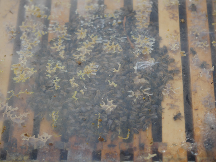 Die Wintervorräte der Bienen bestehen zu einem Teil aus Honig und zum anderen aus Zuckersirup. Zusammen sind das etwa 15 Kilo. Die Kälte allerdings lässt den Honig in den Waben zäh bis fest werden. Da die Bienen lediglich einen Rüssel für die Nahrungsaufnahme haben, muss der Energievorrat innerhalb der Wintertraube (die Aufnahme rechts durch die Abdeckfolie stammt vom 11. Januar) so warm werden, dass ihn die Tiere aufnehmen können.