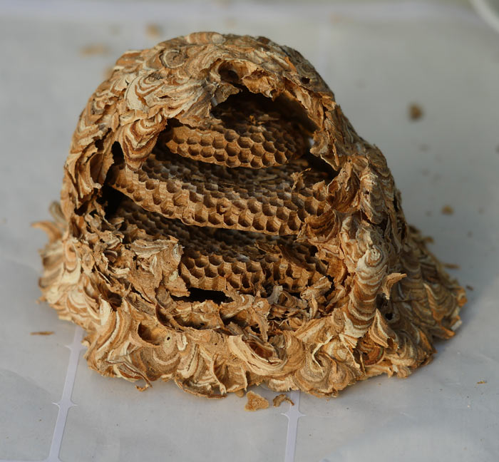 Zuerst ärgerte ich mich über die eigene Dummheit, als mir das dünne und nur wenige Gramm schwere Wespennest zerbrach; unter dem 20.11. können Sie es noch einmal sehen. Dabei hatte ich es vorher noch mit dem Haarspray meiner Frau überzogen, weil ich für mehr Stabilität sorgen wollte.