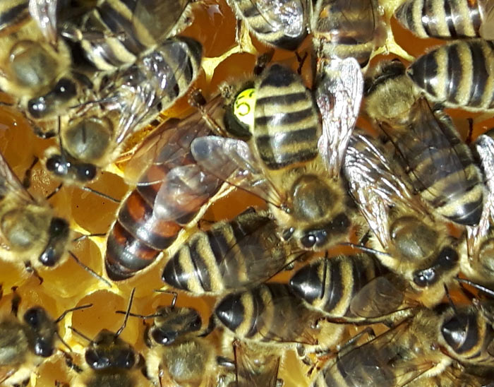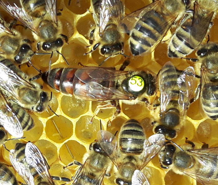 Die inselbegattete Königin selbst bekam ich im vorigen Jahr aus Kroatien geschickt. Sie entstammt einer Zuchtlinie, die mit der Varroa-Milbe besonders gut fertig werden soll. Im Sommer wird sich herausstellen inwieweit das stimmt.