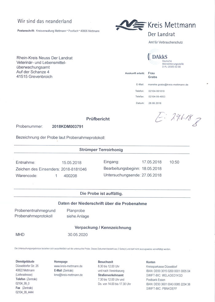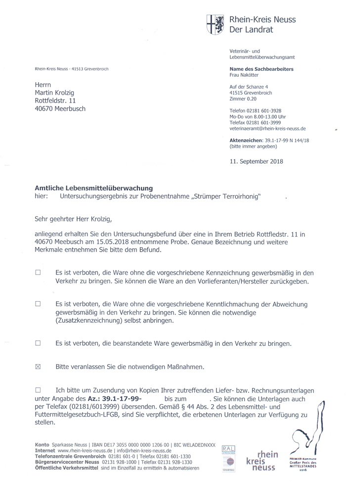 Dieser Tage kam ein Brief von der Lebensmittelüberwachung mit dem Befund.