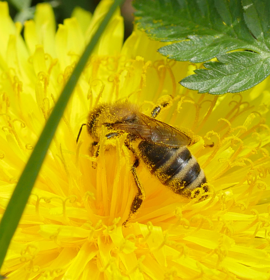 Diese Biene entdeckte ich neben dem kleinen Feldweg. Was sie und ihre Schwestern in wenigen Tagen zusammentragen werden, kann man später in der Frühjahrstracht vom Schürkesfeld als besondere Note durchaus schmecken. Man sagt, Löwenzahnhonig stimuliere die Nieren- und Leberaktivität; Stoffwechsel und Durchblutung werden so angeregt.