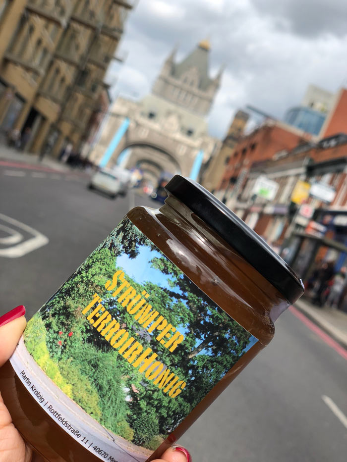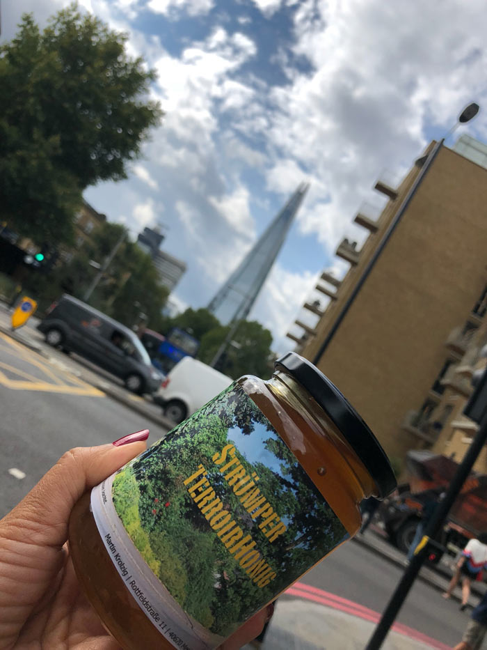 Ob sie nicht, fragte ich die schnieke Honigkäuferin N.D. als sie von ihrem bevorstehenden Besuch in London sprach, also, ob sie nicht ein Glas TerroirHonig, das sie ohnehin mitnehmen möchte, dort vor ein, zwei Sehenswürdigkeiten fotographieren könnte? Das wolle sie gerne tun, lautete die Antwort.