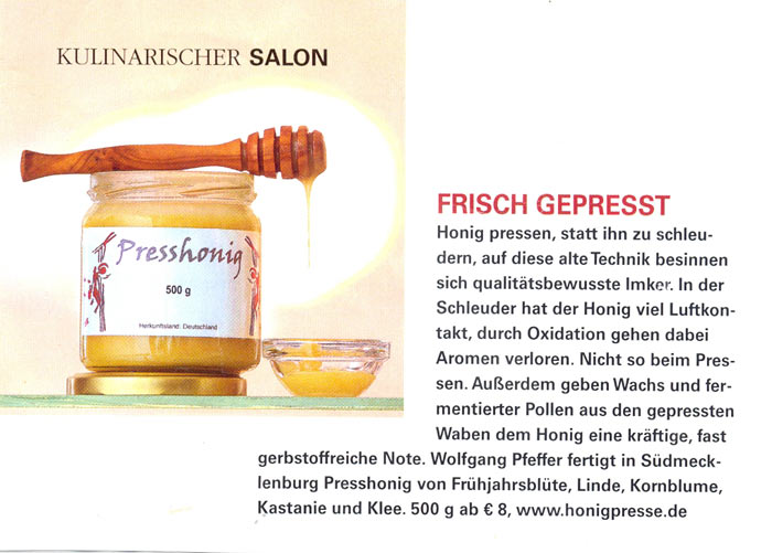 Als sie neulich mal wieder Honig kaufte, fand ich danach den Zeitungsausschnitt kommentarlos auf meinem Tisch. Presshonig? Hatte ich noch nie gehört. Doch überzeugte mich auf Anhieb, dass der Honig beim Schleudern durch die enorme Durchwirbelung mit Sauerstoff von seinem Aromagehalt verlieren muß. Beim Kosten war mir das schon früher aufgefallen. Doch erklären konnte ich mir den Geschmacksverlust damals noch nicht, meinte dann aber, dass mein subjektiver Eindruck in einer defizitären Tagesform seinen Grund haben müsse.