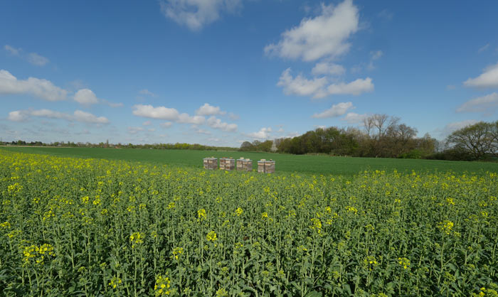 Heute sollte es laut Wetterbericht eigentlich regen. Doch es hellte sich wider Erwarten auf; nach Meinung von Himmel und Erde kam wohl in der Nacht genug Wasser herunter. Also schnell in die Ape geschwungen und ab zum Latumer Bruch. Mit dabei eine Leiter, um den Rapsacker von einer leichten Erhöhung aus besser aufnehmen zu können. Bei einer ähnlichen Aktion, erinnerte ich mich dabei, stürzte ich im letzten Jahr ziemlich übel auf die Ellenbogen.