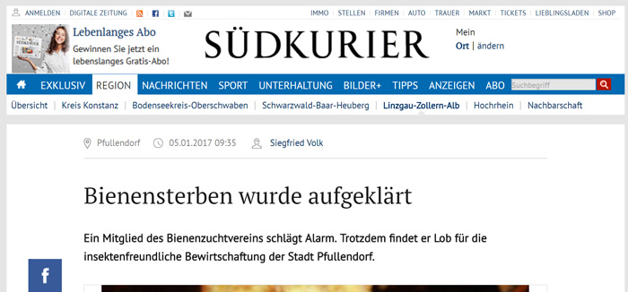 So starben bei dem Kollegen Markus Weber eine Reihe von Völkern. Er hatte auch einen Verdacht, wer daran die Schuld trägt. Beides teilte er seiner örtlichen Zeitung mit. Um die Größenordnung des Desasters zu unterstreichen ergänzt er, dass auch andere Imker von einem unnormalen Bienensterben zu berichten wussten. »Unerklärliches Bienensterben« das Reizwort schreckt inzwischen jeden Journalisten inzwischen auf. suedkurier.de
