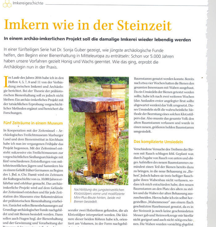Schon vor 5000 Jahren, läßt uns Frau Guber wisssen, erntete man in Mitteleuropa Honig und Wachs. Nun fand man eine alte Beute – oder was man dafür hielt – und die Dame kam auf die aberwitzige Idee sie nachzubauen und mit Bienen zu besiedeln.