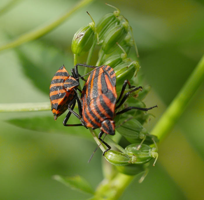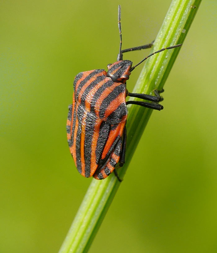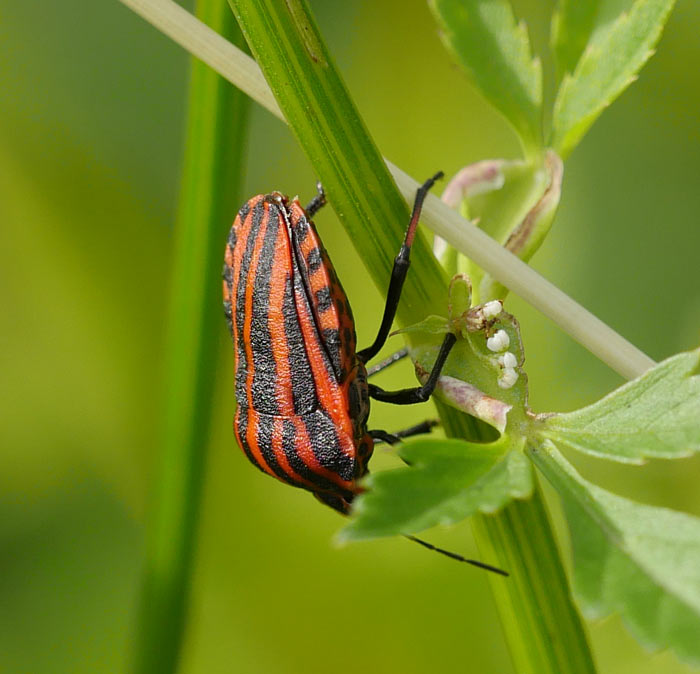 Giersch muß den apart rot-schwarz gestreiften Käfern als schönste Weide dienen. Inzwischen konnte ich auch den Namen des Tieres in Erfahrung bringen: Streifenwanze (Graphosoma lineatum). Den muß ihm ein übellauniger und phantasieloser Mensch verpaßt haben. Das gibt wieder einmal Gelegenheit über die tödlichen Bedrohung nachzudenken, die in solchen Bezeichnungen steckt: Wanzen sind Ungeziefer, die man konsequent bekämpfen muß.