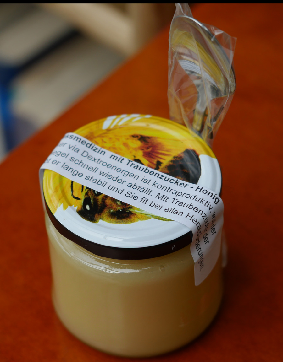 „Stressmedizin mit Traubenzucker-Honig“ steht auf dem Etikett. Und weiter: „Traubenzucker via Dextroenergen ist kontraproduktiv, weil der Blutzuckerspiegel schnell wieder abfällt. Mit Traubenzucker der Frühjahrstracht bleibt er lange stabil und Sie fit bei allen Herausforderungen“