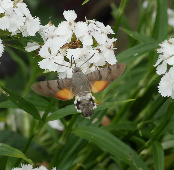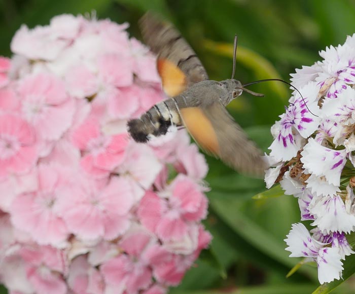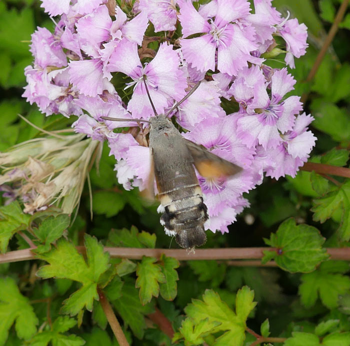 Eigentlich gab ich mir keine Chance. Im Vorgarten der Nachbarin hatte ich das Insekt gesehen. Mit seinem langen Rüssel erinnerte es mich an einen Kolibri. Also schnell ins Haus zurück, die Kamera geholt – da flog es noch immer ziemlich aufgeregt zwischen den Blüten der Bartnelken hin und her. Ein paar Aufnahmen, dann war es verschwunden.