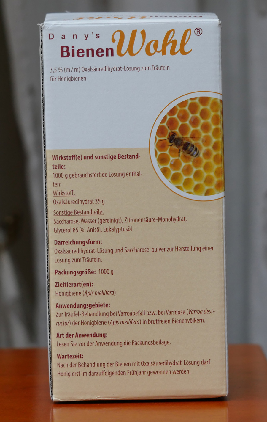 Auf dem Foto sehen Sie eine Packung Bienenwohl. Dabei handelt es sich um Oxalsäure zur winderlichen Restentmilbung , die mit verschiedenen Zusätzen angereichert ist. Die sollen den Putztrieb der Bienen anregen. So wird die Oxalsäure auf praktisch alle Tiere in der eng sitzenden Wintertraube verteilt. Ich verwende das bewährte Mittel seit Jahren erfolgreich. Das Problem: Es ist nur in Österreich zugelassen. Darf man Bienenwohl in Deutschland deshalb nicht verwenden? Viele meinen das. Was aber wohl falsch ist. Fakt scheint zu sein: Ein Mittel, das in einem EU-Land zugelassen ist darf in allen anderen europäischen Ländern auch verwendet werden. Ich beziehe Bienenwohl über die Imkergenossenschaft in Salzburg. Der Rechnung entnahm ich zu meiner Verblüffung, daß die Firma Danny-Bienenwohl in München angesiedelt ist.