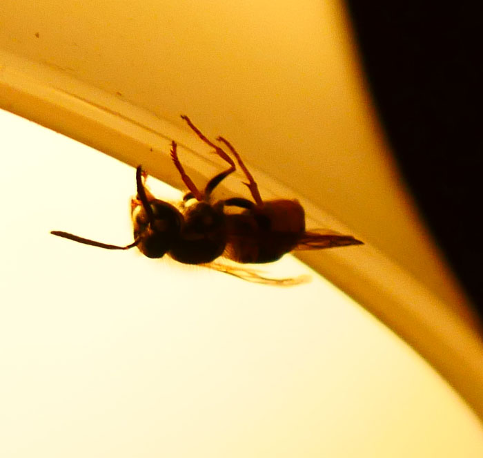 Hier sehen Sie unser neues Haustier. Die Wespe, und um eine solche handelt es sich, lebt seit ca. zehn Tagen bei uns. Da ich mich zu den Wespenfreunden zähle, beobachtete ich sie eher als dass ich sie zu vertreiben suchte. Wenn schon einmal Bienen in unserer Wohnung sind – was in der Saison häufiger vorkommt – dann werfe ich ein Handtuch über sie, während sie am Fenster auf und ab fliegen. So kann ich sie ziemlich sicher nach draußen expedieren und sie finden wieder zu den ihren zurück.