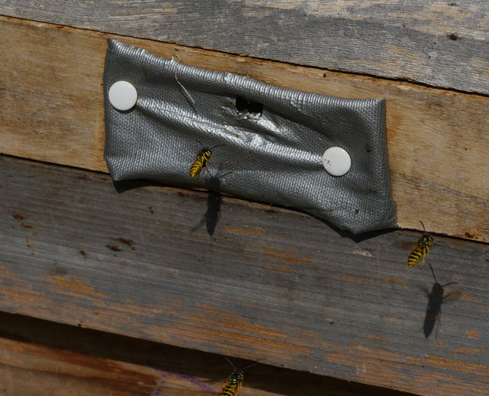 Nicht nur Menschen, sondern auch Bienen empfinden Wespen als lästige Quälgeister. Ob sie einem Volk wirklich gefährlich werden können, glaube ich nicht. Dafür fehlt ihnen die Masse. Doch Wespen verfügen mit ihrem Schneidgerät über ein Werkzeug, das den Bienen fehlt. Auf dem Foto sehen Sie, wie sich die Wespen Zugang zu einem Bienenvolk verschafften. Sie frästen einfach ein Loch durch eine stabile 3M-Folie.