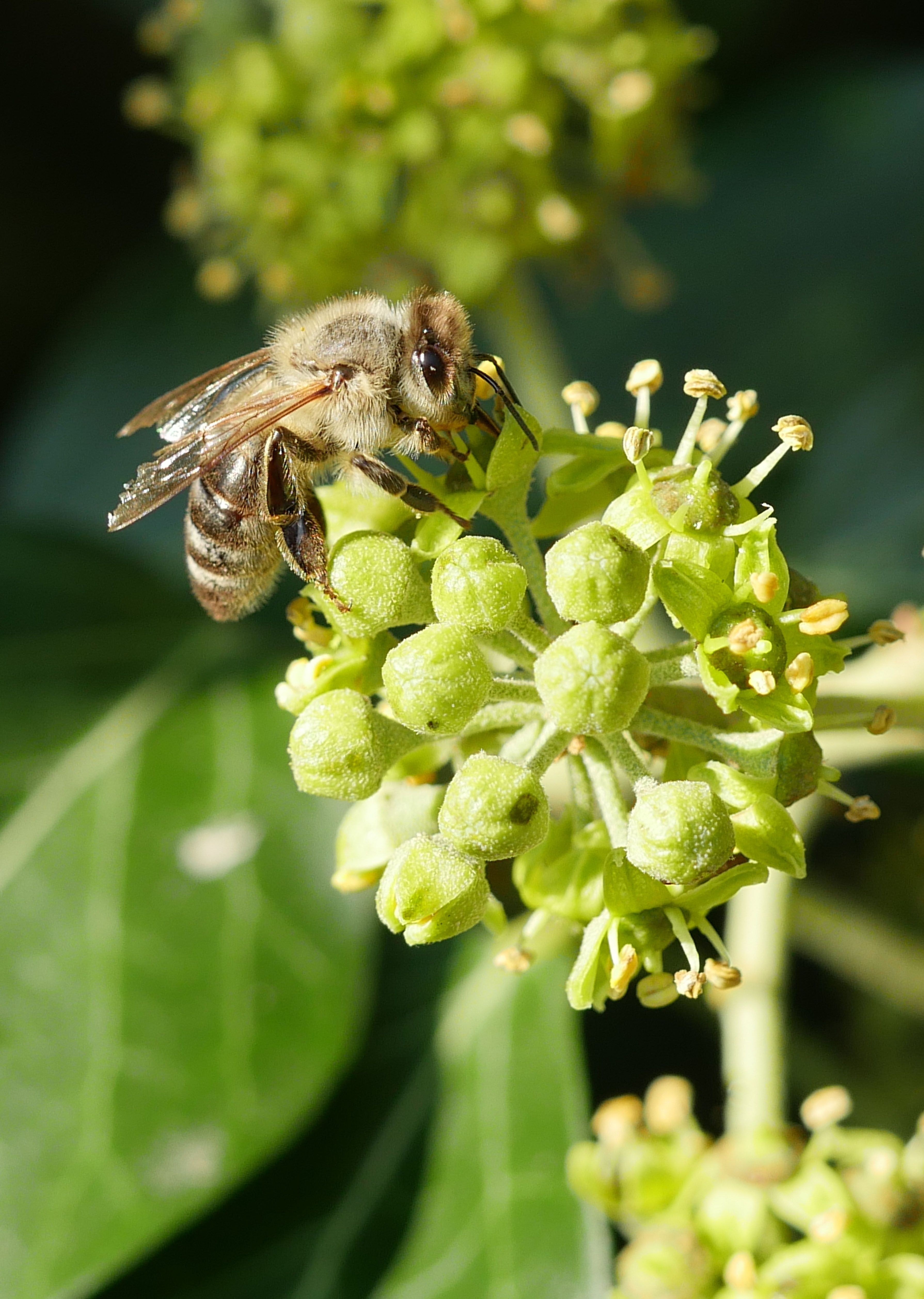 Die nebenstehende Aufnahme entstand am 15. September 2016 in unserer Efeuhecke. Ist das noch eine Sommerbiene oder handelt es sich schon um eine Winterbiene? Schwer zu sagen.