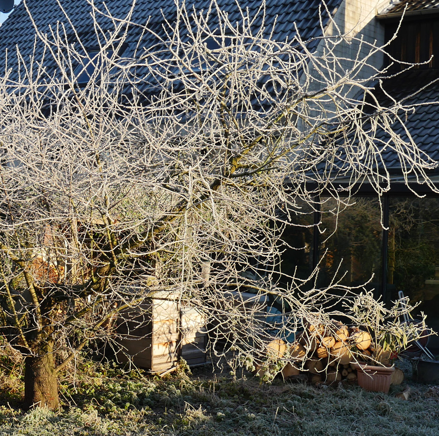 Die Zweige der Kirsche sind mit Raureif überzogen. Sie glitzern in der blendenden Wintersonne. Zu sehen sind zwei Völker im Rottfeld. Das eine befindet sich noch auf drei Zargen, was eher die Ausnahme ist. Vor ein paar Wochen hatte ich noch eine neue Königin auf ein relativ schwaches Volk gesetzt.